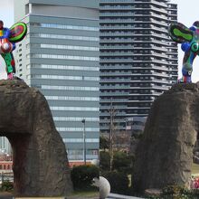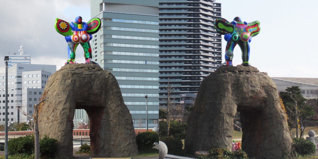 地行中央公園の桶井川に近いところに奇妙なオブジェがありました。フランスの女流彫刻家ニキ・ド・サンファールさんの「大きな鳥の愛」という作品だそうです。1993年(平成5年)に製作されたものです。この作品は2のシンボルが結合されているそうです。1つはエジプト神話に登場するホルス神です。頭から嘴の辺りが似ていると思いました。もう1つは、ギリシャ神話に登場する愛を司る神キューピットです。それぞれ思いが込められているそうですが、形といい、派手な彩りといい良く分りませんでした
