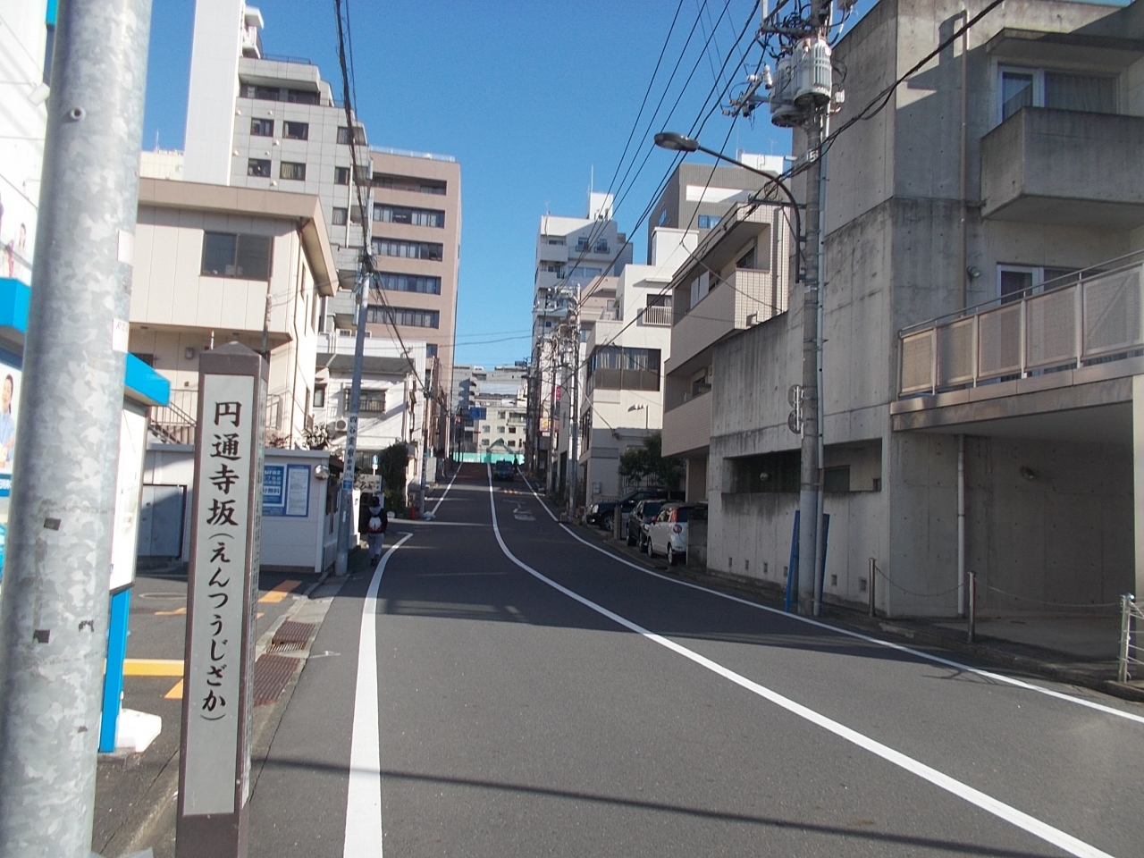 この円通寺坂は新宿通りから南に下る坂の一つです。地下鉄東京メトロ丸の内線四谷三丁目駅から東にすぐの場所にあります。この坂の坂下には円通寺があります。今は両方がビルなどの建物です。かつては寺院が並んでいたのでしょう。かつての姿は今は想像するだけです。