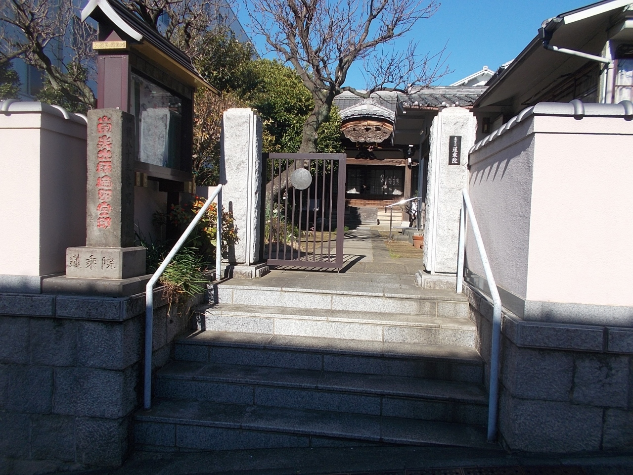 この蓮乗院は観音坂の途中にあります。地下鉄東京メトロ丸の内線四ツ谷駅から西に10分程度の場所にあります。四谷霊園である真成院の北側にある小さな寺です。坂のを上っていてここも寺だと気づきました。真言宗の寺です。16世紀末に創建され17世紀の初めに現在の場所に移築したのです。門柱がないと気づかないです。