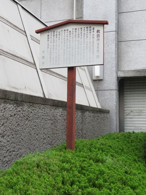 幕末に京都の庶民教育機関であったのがこちらの教諭所です。こちらでは経書講釈や心学道話の授業が行われていました。焼失後に再建されましたが、1869年下京四番組小学校となり、この教諭所は消滅しました。現在は、ビルの植え込みに説明が書かれた立て看板が立っているだけの寂しい場所です。