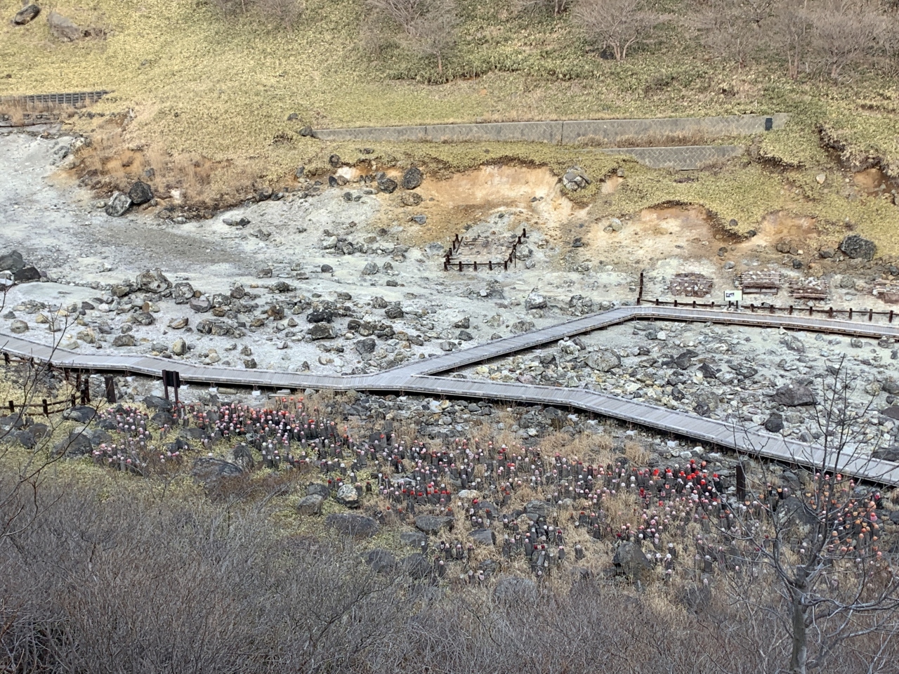 千体あるとは思えませんが、散策路にある見どころの一つではあります。殺生石への木度の中にあり、歴史を感じる事が出来ます。隣には休憩所があるので、天気が悪い時はそこから眺めるのも面白いです。鹿の湯周辺の散策ポイントです。