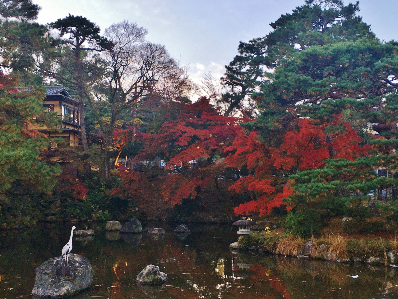 1886年に開園した京都市内で最も古い公園です。八坂神社の東にあり、広大な敷地内には回遊式日本庭園を中心に、料亭や茶店があります。京都随一の桜の名所としても知られ、公園の中央に咲く大きなしだれ桜はとても綺麗です。紅葉の時期に朝の散策で訪れました。日中は観光客で賑わいますが、人もおらず静かで赤く染まった木々が風情ある景色でした。