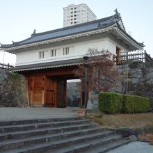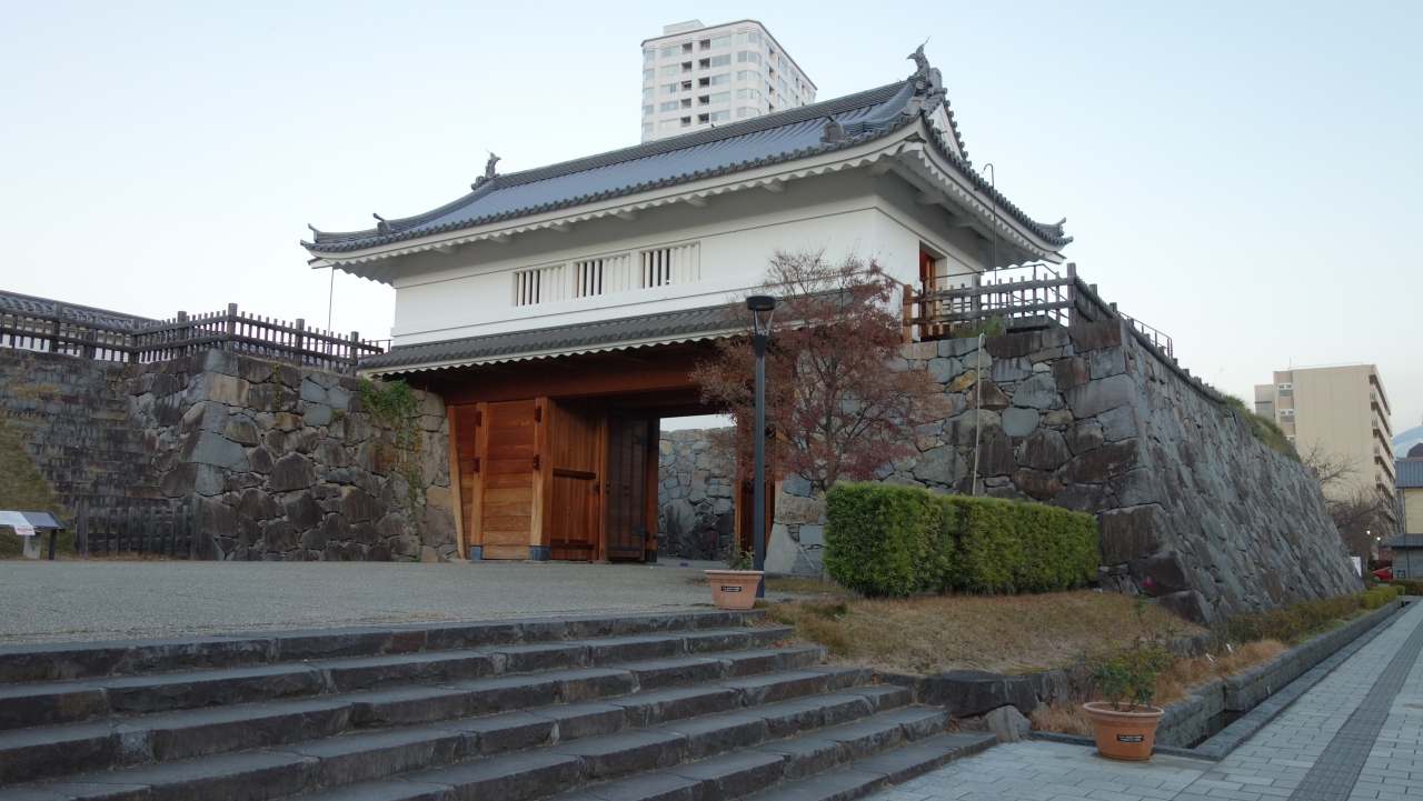 甲府に滞在中こちらの場所を訪れました。甲府駅の北東側に位置する歴史公園に置かれた甲府城の大きな門です。復元された姿がかなり新しく美しいので歴史上の遺構といった印象は感じられませんでしたが、重厚な門は見ごたえ充分でした。