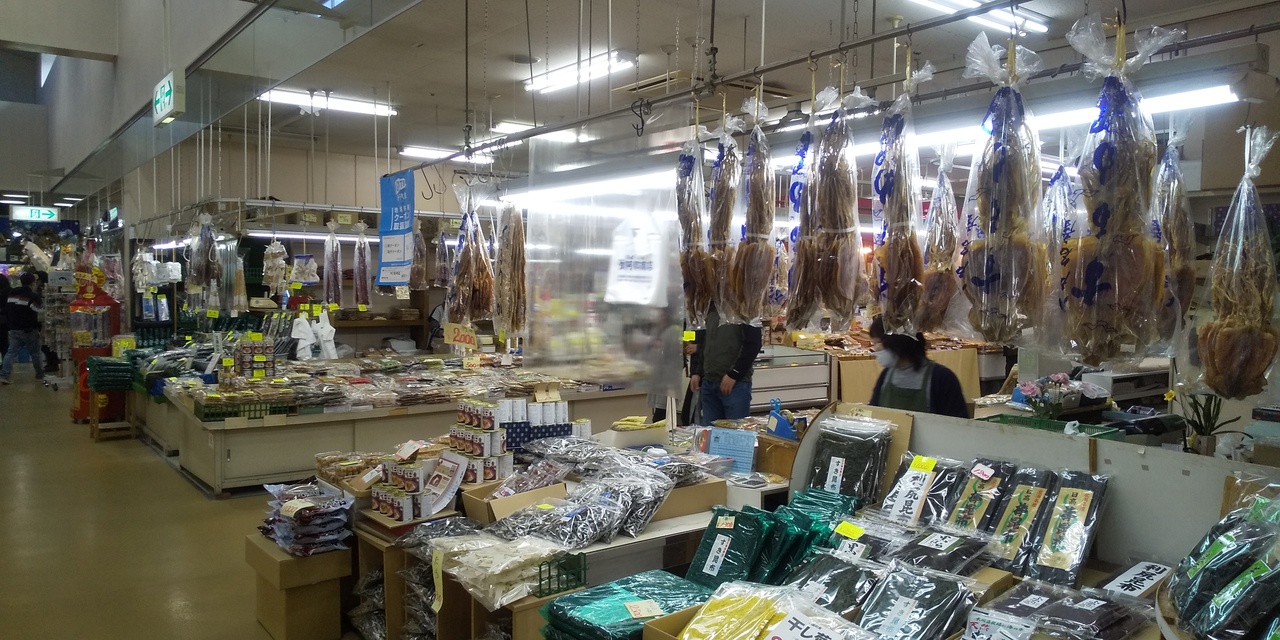 驚くほど広い売場面積で、海産物を中心に精肉、青果、お菓子類やお酒を販売しています。イカ、ホタテは名産で、とにかく新鮮で安く購入できます。
