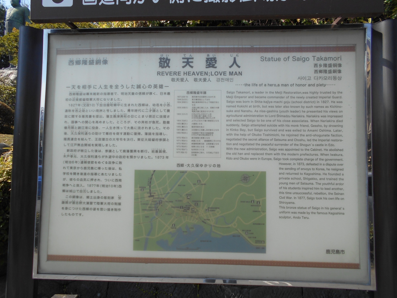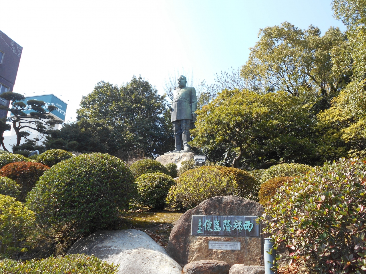 上野のゆかた姿のラフな感じの西郷隆盛銅像とは異なり、日本初の陸軍大将の制服姿で仁王立ちしています。西郷隆盛没後50年祭記念事業として1937年に銅像が完成しました。高さ8メートルの堂々とした姿は新しい日本の未来を見つめているのかもしれません。