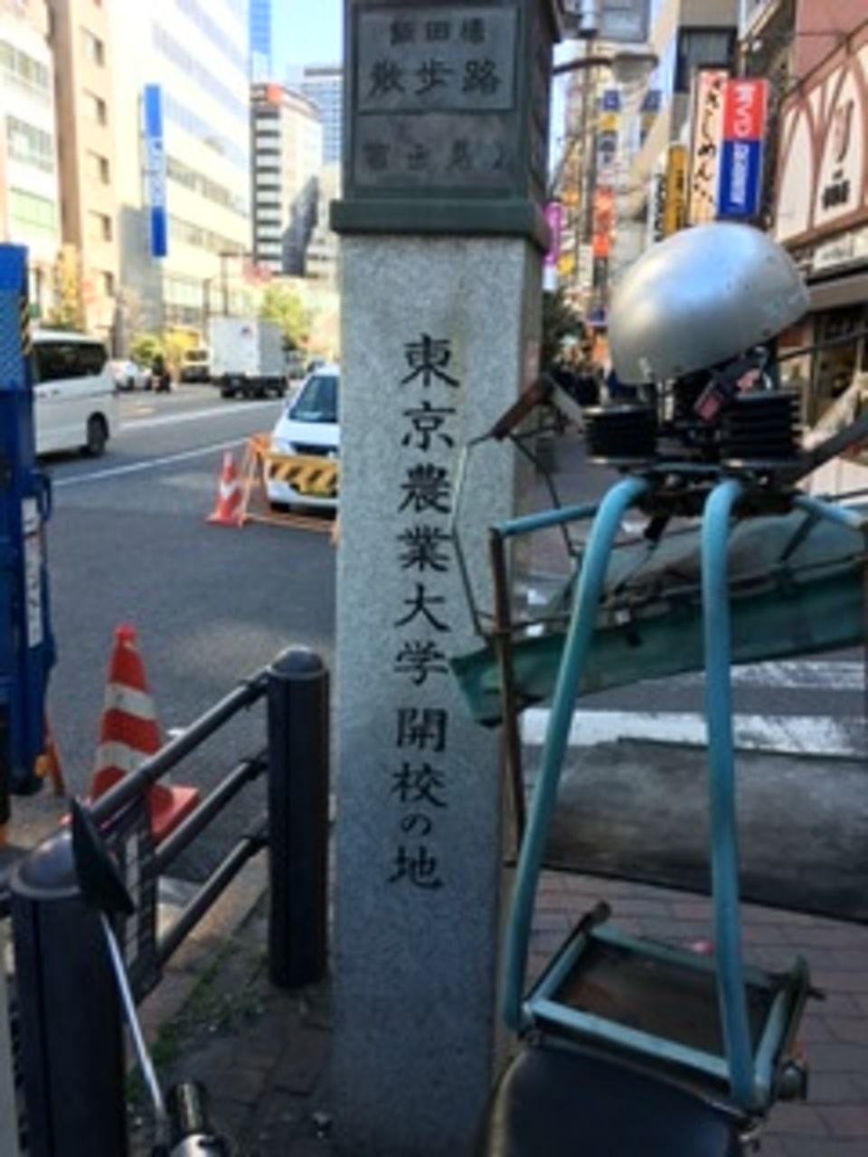 JR中央線飯田橋駅東口を出て目白通り沿いに南に進むと横断歩道を渡ってすぐの場所に案内板がありました。あくまでも「開校の地」であって、他の都内にあるほとんどの大学と同様に移転してここに何もなくなっています。明治時代初期にはすぐ先に牧場があったり、また農地を必要とする農業大学があったりと、今の喧噪からは想像できないのどかな場所だったのですね。
