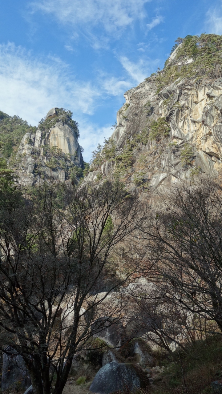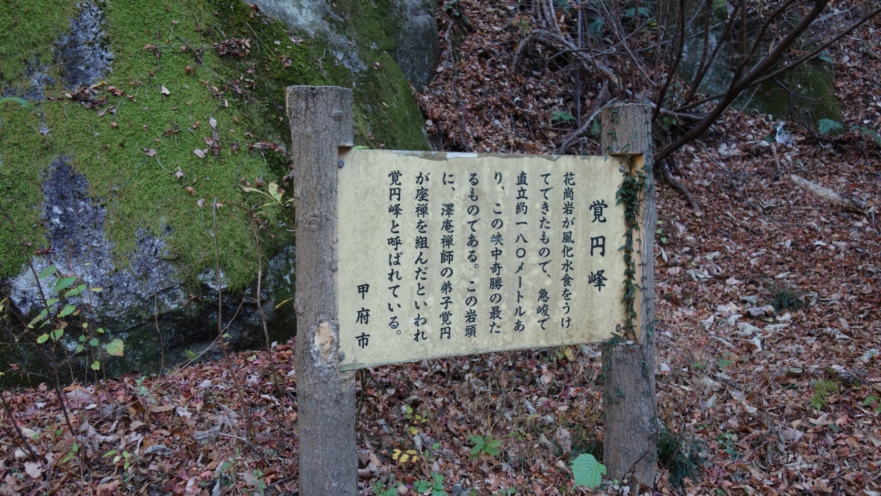 甲府に滞在中こちらの場所を訪れました。昇仙峡を訪れた日、川沿いの散策道を上がっていくと覚円峰が見えました。松の木々がへばりつくように生える緑の中に有る巨岩の姿は一見の価値ありで、昇仙峡の幾つもの見どころの中でも人気の場所です。