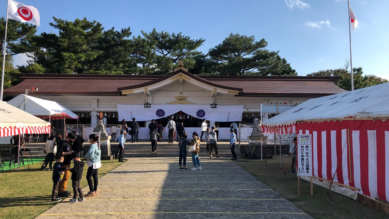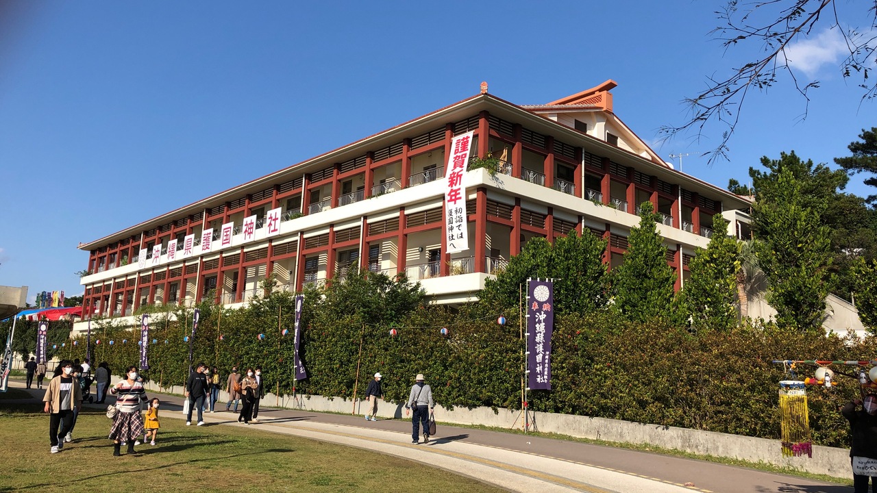 首里観音堂、波の上宮などと並ぶ、那覇市の初詣スポットです。奥武山公園内にあります。護国神社という名前のとおり、戦争で亡くなった軍人や一般の人々を祀っています。奥武山公園の入口から本殿まではけっこう遠く、400mぐらい歩きました。