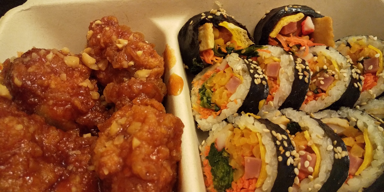 京成町屋駅改札口近くのテイクアウト専門のチキン料理です。お隣の韓国からやって来た料理で味付けは甘辛の新感覚。韓国ののり巻きキムパプやカップ麺の販売もしています。テイクアウト弁当はチキンとキムパプのく見合せがおすすめとか、ややニンニクが効いているから匂いは注意かな。