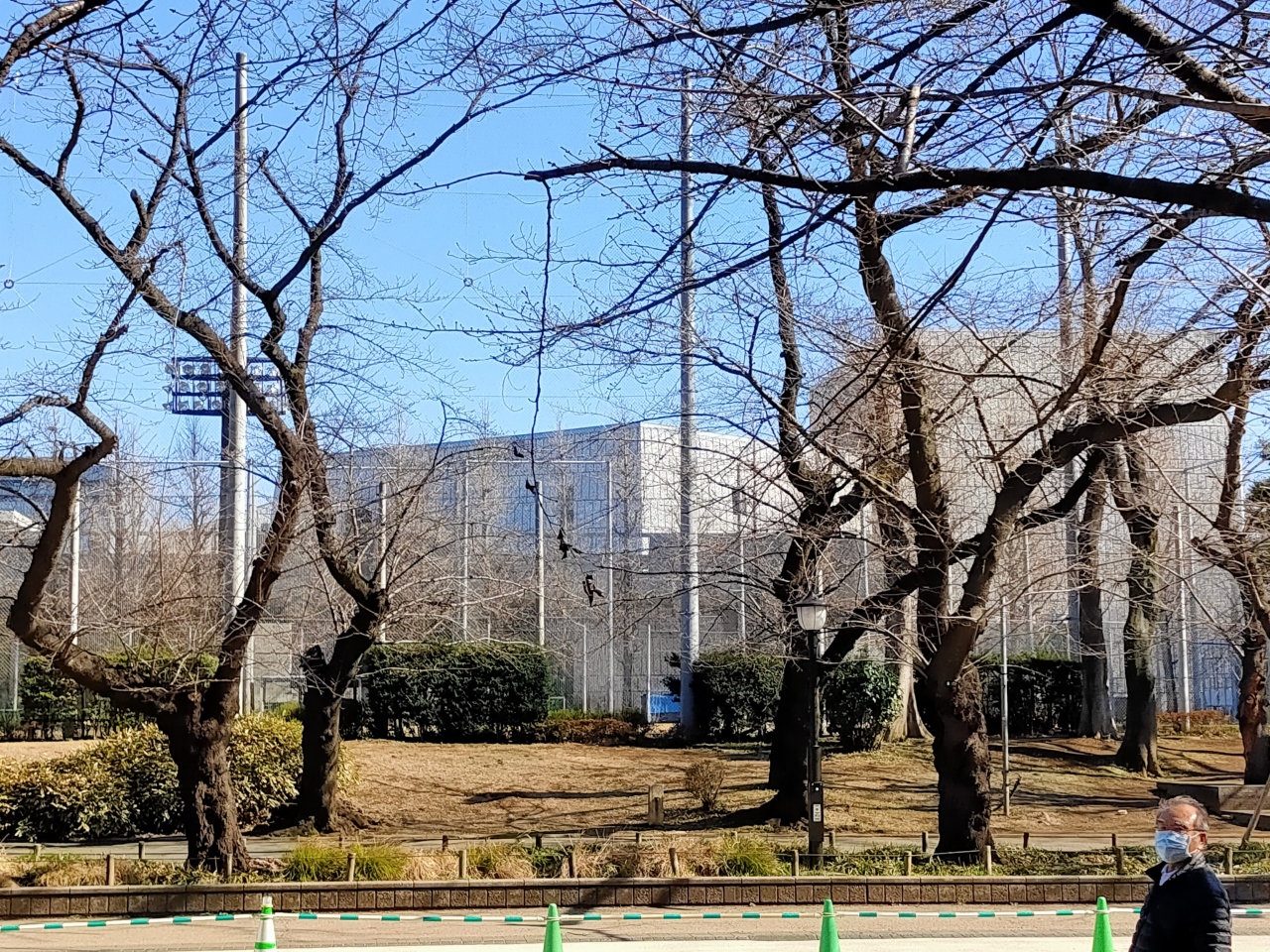 公園の真ん中にあるので、気を付けて見ないと気が付かない人も多いと思います。照明施設や高いネットがかろうじて見えます。