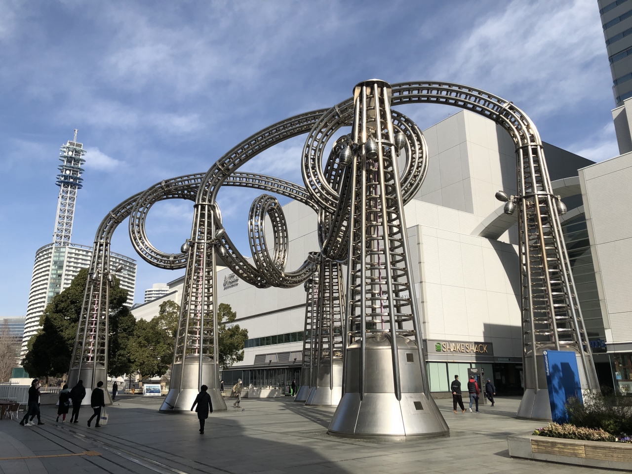 横浜ランドマークとクイーンズスクエア横浜の間にある、ジェットコースターのようなオブジェです。武蔵野美大の教授だった最上壽之氏の1994年の作で、高いビルの間の風の通り道を意識して、たなびく雲をイメージして造られました。デザインだけでなく、強いビル風を緩和する機能も備えていると言われています。