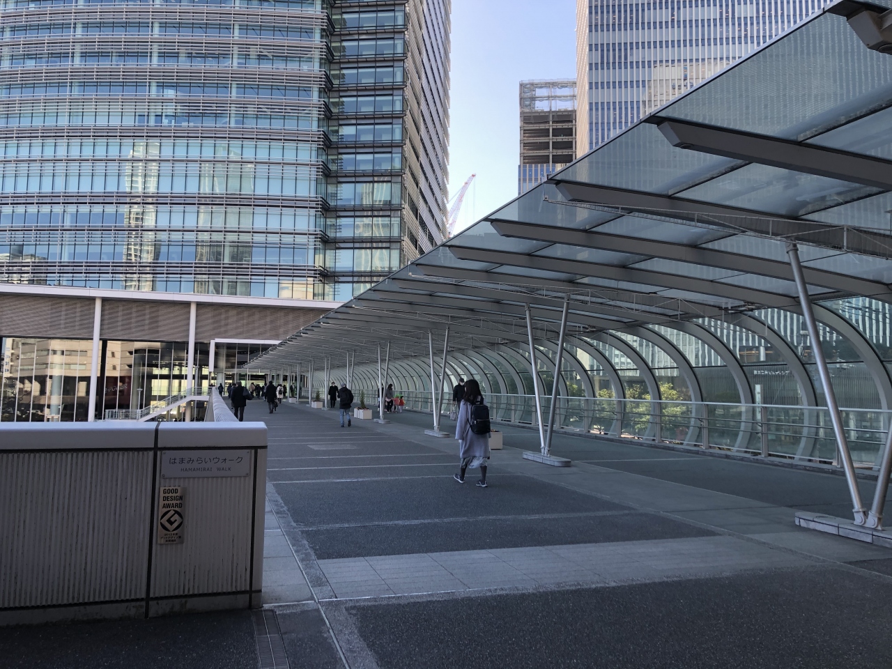 横浜駅からみなとみらい地区(グランモール周辺)へのアクセスに便利な橋(人道橋)です。帷子川に架かっている橋で、マルイシティ横浜と日産グローバル本社ギャラリーとをつないでいる、全長は100mほど。通路の片側半分だけにガラス張りの屋根がある、少し変わった作りです。