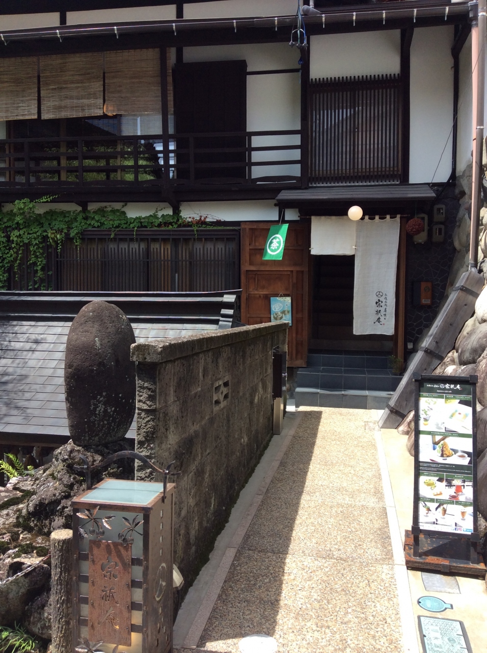 宗祇水のほとりにある古民家カフェー、お勧めはほうじ茶ゼリー、抹茶プリン、玄米パフ、白玉などが美しく重なった「宗祇庵パフェ」と抹茶のセット。パフェの一番上には郡上八幡の夏の風物詩「郡上おどり・かわさき」のポーズをかたどった抹茶アート、見た目も味もよかった。一服づつ点てるお抹茶も美味しかった