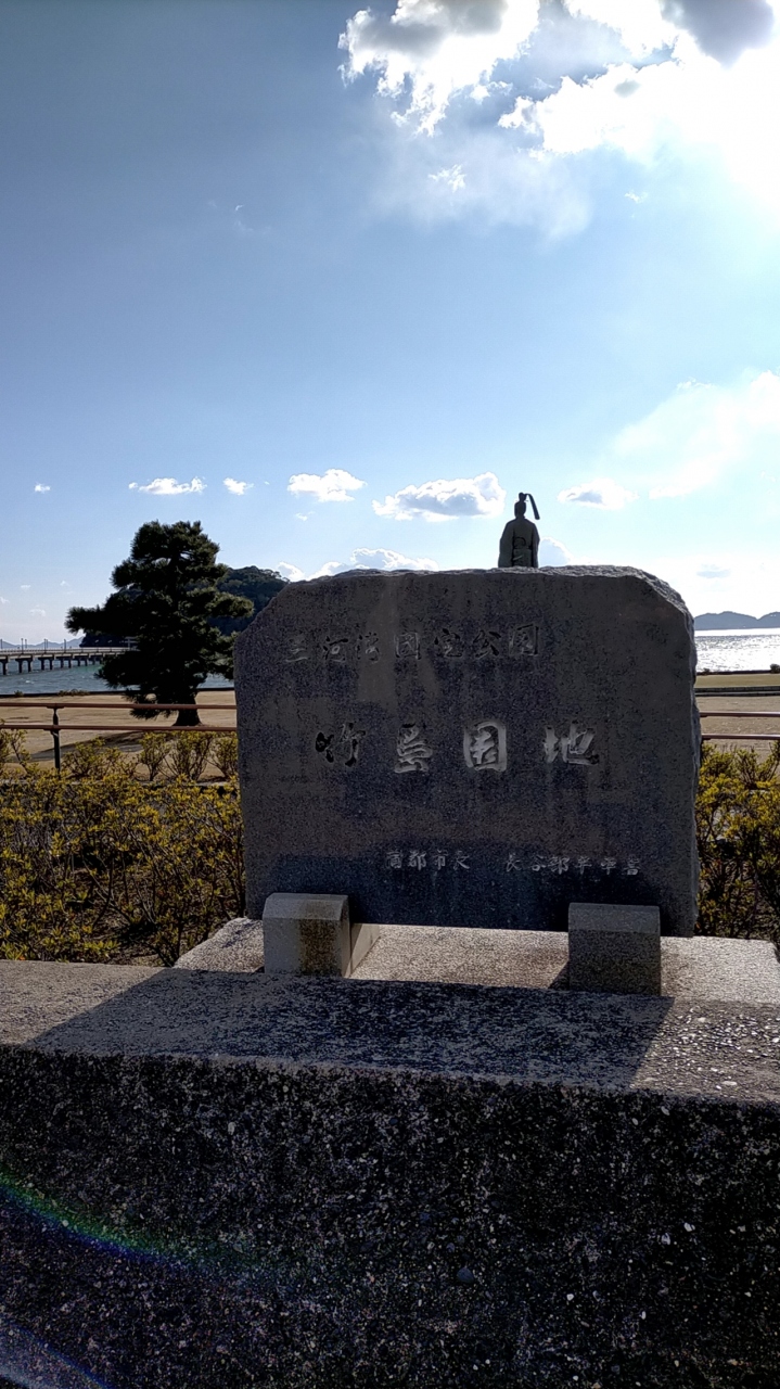 海岸の竹島ベイパークの『俊成苑』には、とっても立派な藤原俊成像が八百富神社の方角を見つめて建っていました。