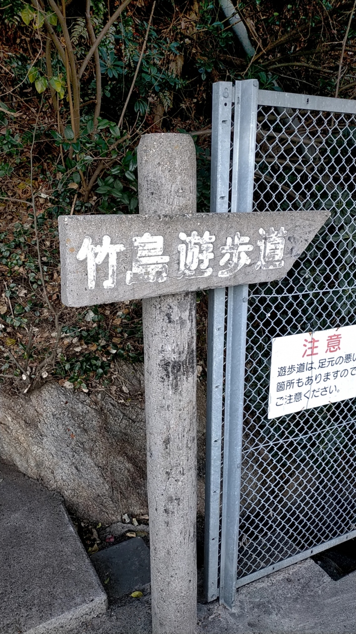 岸から伸びる約400メートルの橋を渡り切った右側に竹島遊歩道へ入る案内がありました。