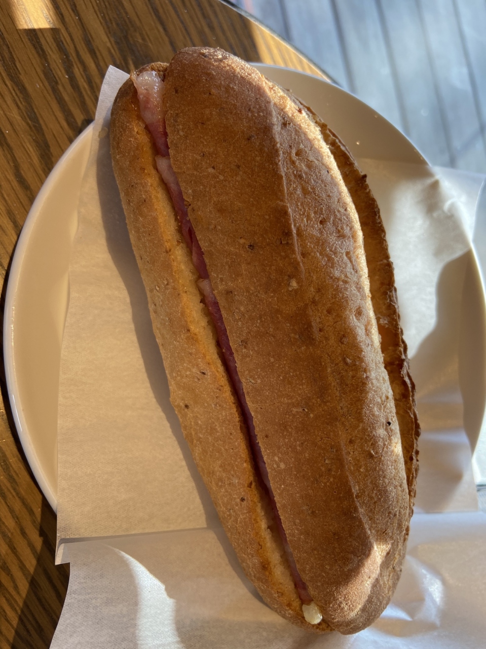 近鉄奈良駅から10分ほどのところにある鴻池運動公園の一角にあるスターバックスさんです。お腹が空いていたので、何かサンドイッチ系をいただきたいと思い。ハムとマスカルポーネのパンを、温めてもらいました。チーズの溶け具合が最高に美味しかったです。