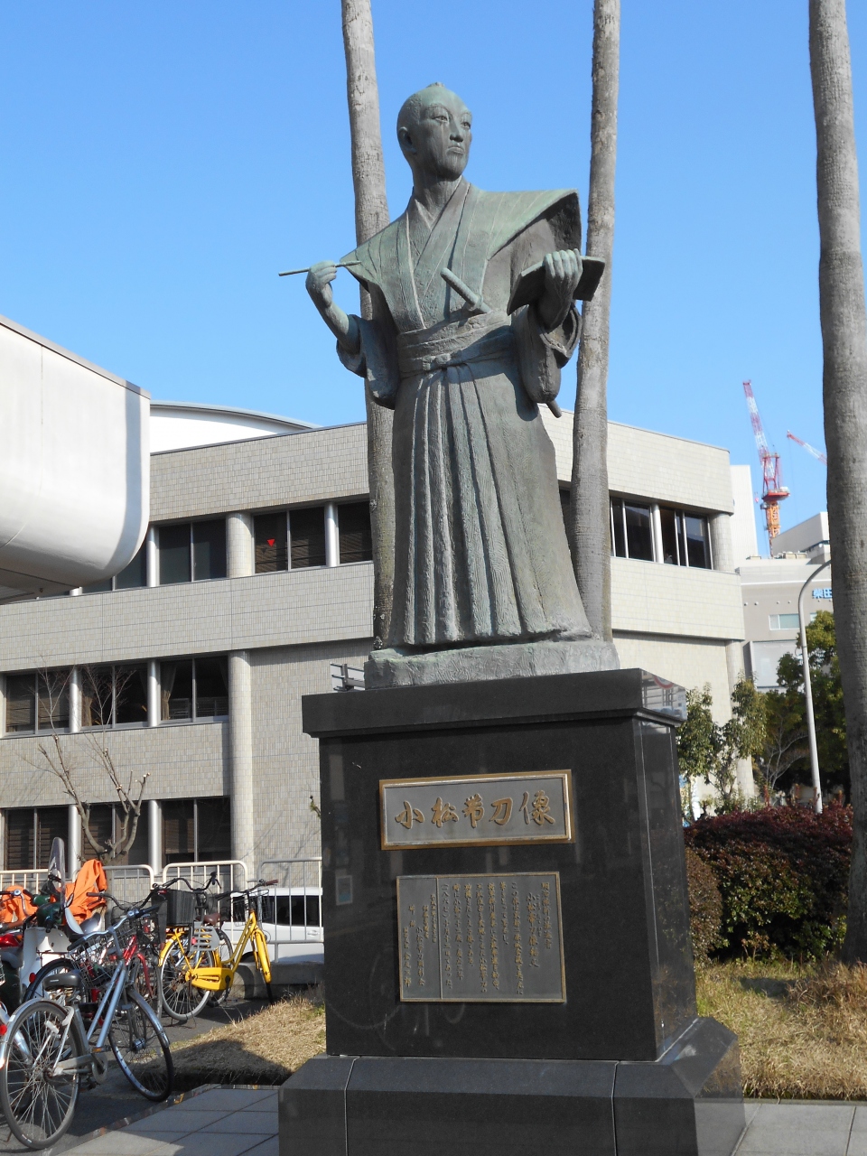 薩摩藩の家老として大政奉還に大きな役割を果たした人物ですが、大河ドラマ「西郷どん」を見るまでよく知りませんでした。西郷や大久保の活躍はこの人物が尽力によるもの思います。幼少の頃から聡明で、学問を好んだ小松帯刀を表現するように左手に書を右手に筆を持った銅像です。