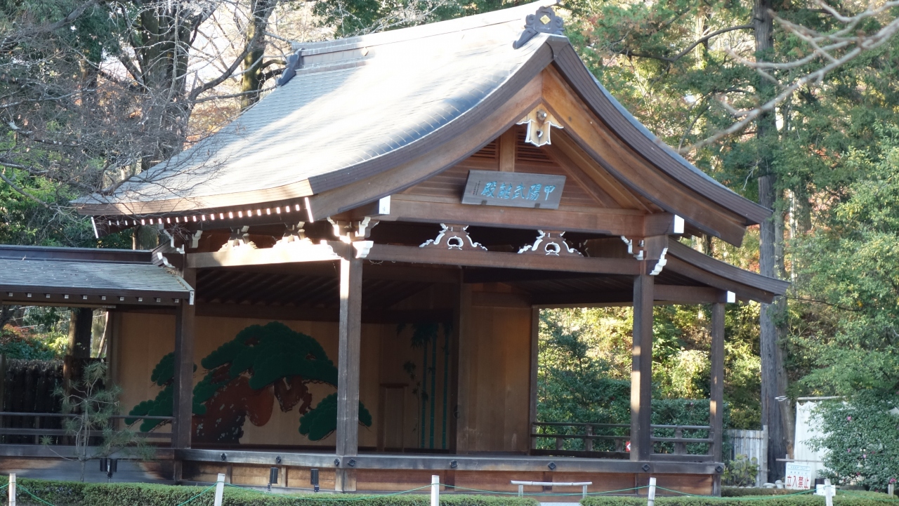 甲府に滞在中こちらの場所へ立ち寄りました。甲府駅の北側に位置する武田神社の境内にある能楽の舞台です。武田家三代の居宅であった躑躅ヶ崎館の能舞台を見ていると、武芸に通ずるものはを舞も嗜むと言われている通りの風流な印象を持ちました。
