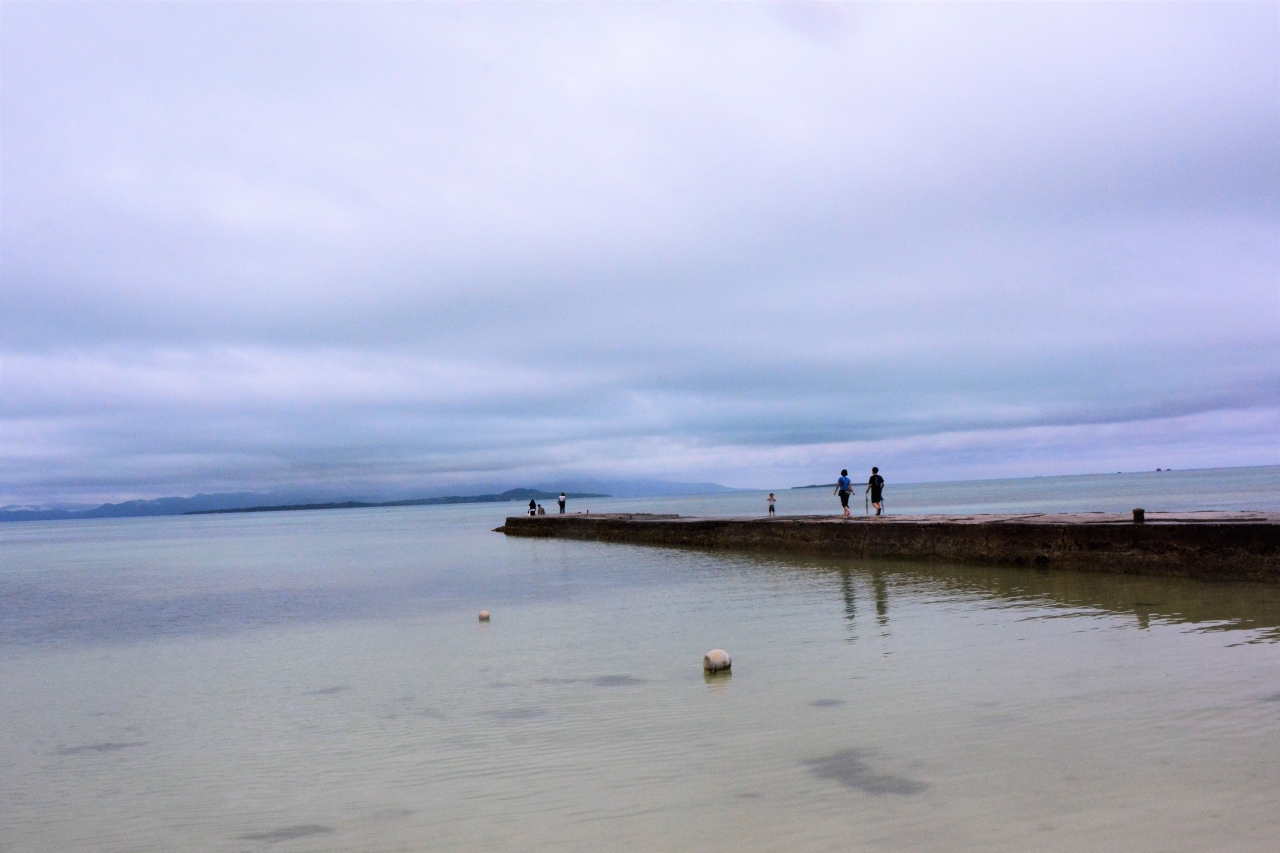 澄み切った海に突き出る桟橋から遠くに西表島が見えます。