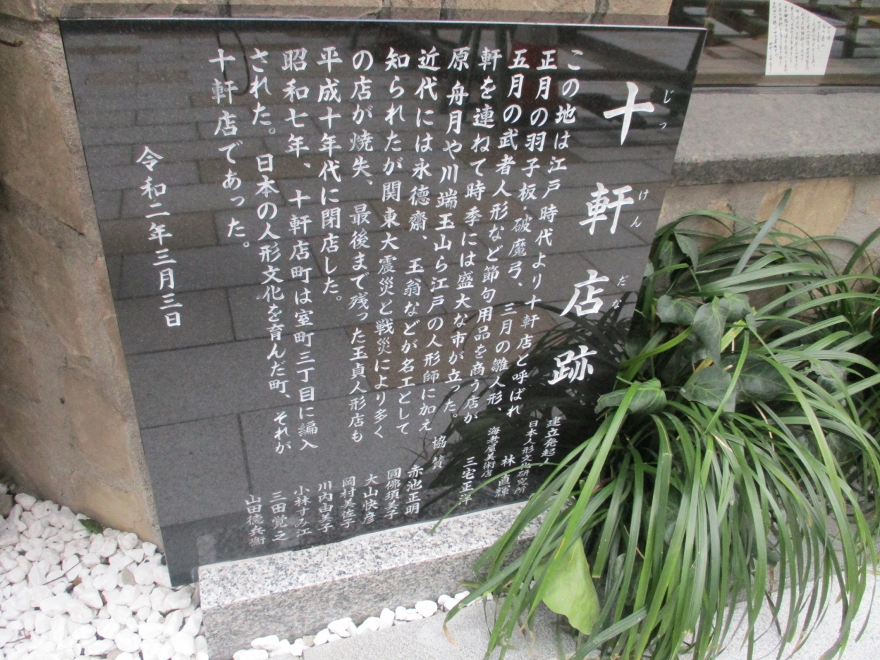 日本橋・中央通りにあるコレド室町テラスの前に説明板があります。五代将軍綱吉が京都のひな人形師10人を招き、ここにお長屋10軒を与えました。お節句の飾りはとても見事だったそうです。節句や年末年始には他に市も立ち、大変賑わったそうです。