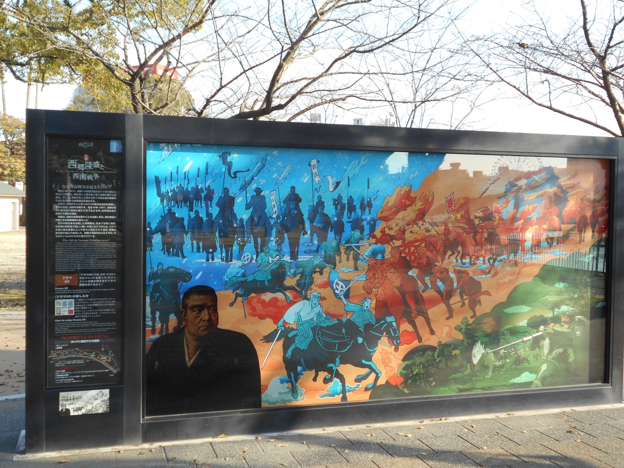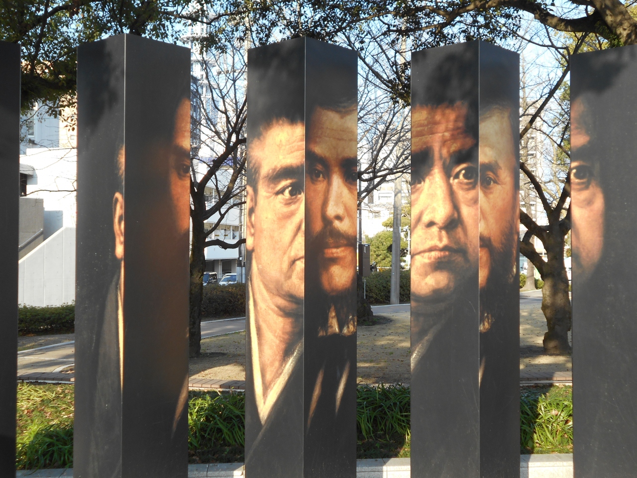 甲突川沿い左岸、約440mの間の整備された明治維新や、その後の日本の近代化のために活躍した偉人を顕彰した施設です。薩摩が生んだ二人の明治維新の立役者西郷隆盛と大久保利通が6本の柱になって斜めから見ると肖像画に見えるトリックアートがあります。その他、7つの歴史ドラマについて,写真やイラストなどで解説があり、楽しく歴史を学ぶことができます。