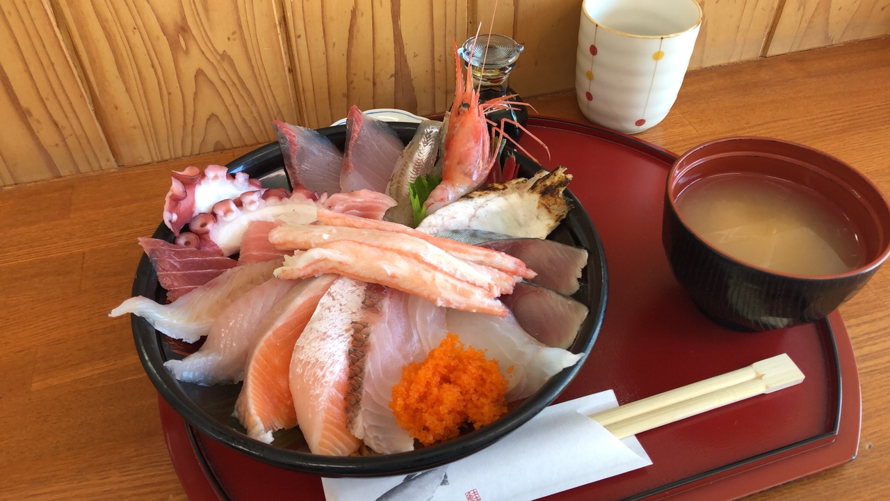 予約でいっぱいということでしたが、空席があり入ることができました。1800円のマグロ、カニつきの海鮮丼を頼みました。ご飯少なめですが、とにかく魚が多い!嬉しい悲鳴です。海鮮を堪能しました!