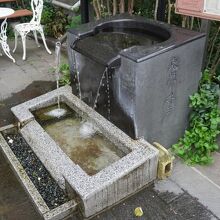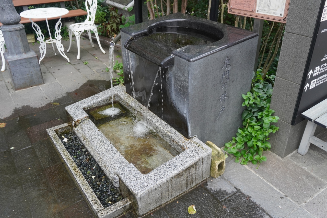 東門の井戸は、松本ホテル花月の横、下町会館敷地内にある湧き水。黒と白のツートンの落ち着いたデザインは町の風景に自然に溶け込んでいる感じ。水の量もけっこう多くて、辺りにはバチャバチャ水が元気に跳ねています。