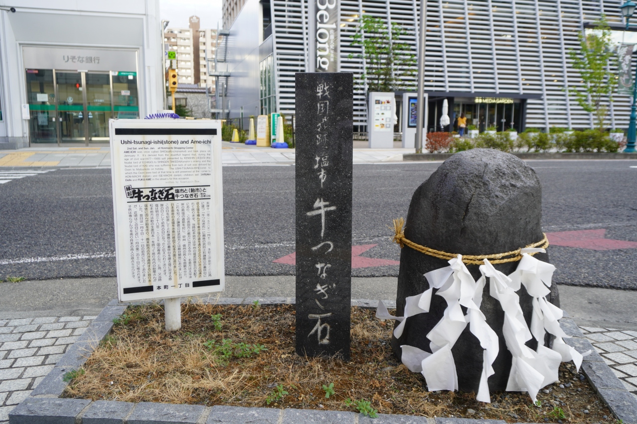 牛つなぎ石は、松本市の中心。本町通りと伊勢町通りの交差する道路の角。神社にある紙垂の付いた注連縄で立派に守られています。