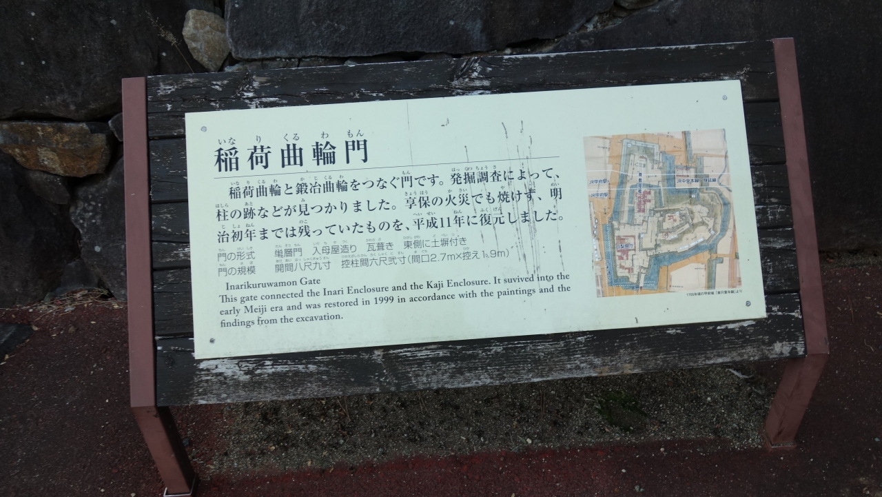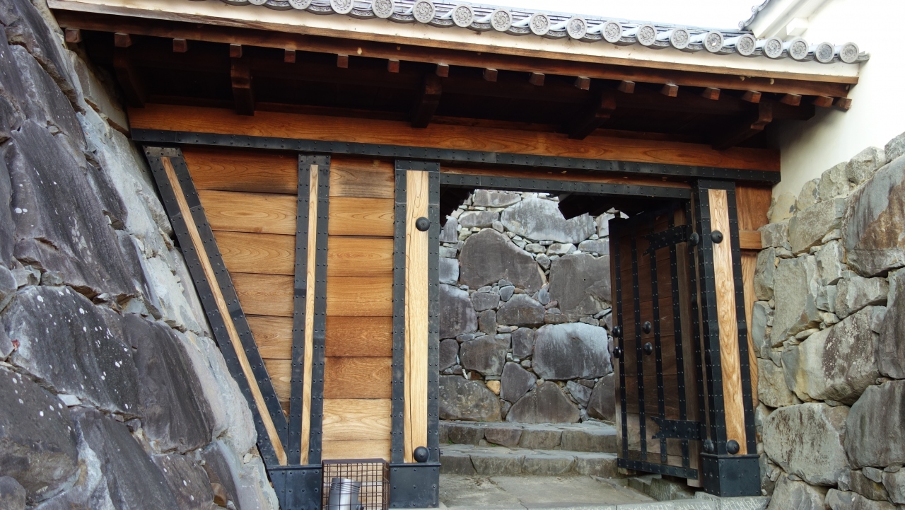 甲府に滞在中こちらの場所へ立ち寄りました。稲荷曲輪門は舞鶴城公園にある甲府城の遺構で、鍛冶曲輪門から入場し東の方へ向かうと現れます。復元された物なので新しい印象でしたが鉄の縁取りが重厚さを感じさせていました。