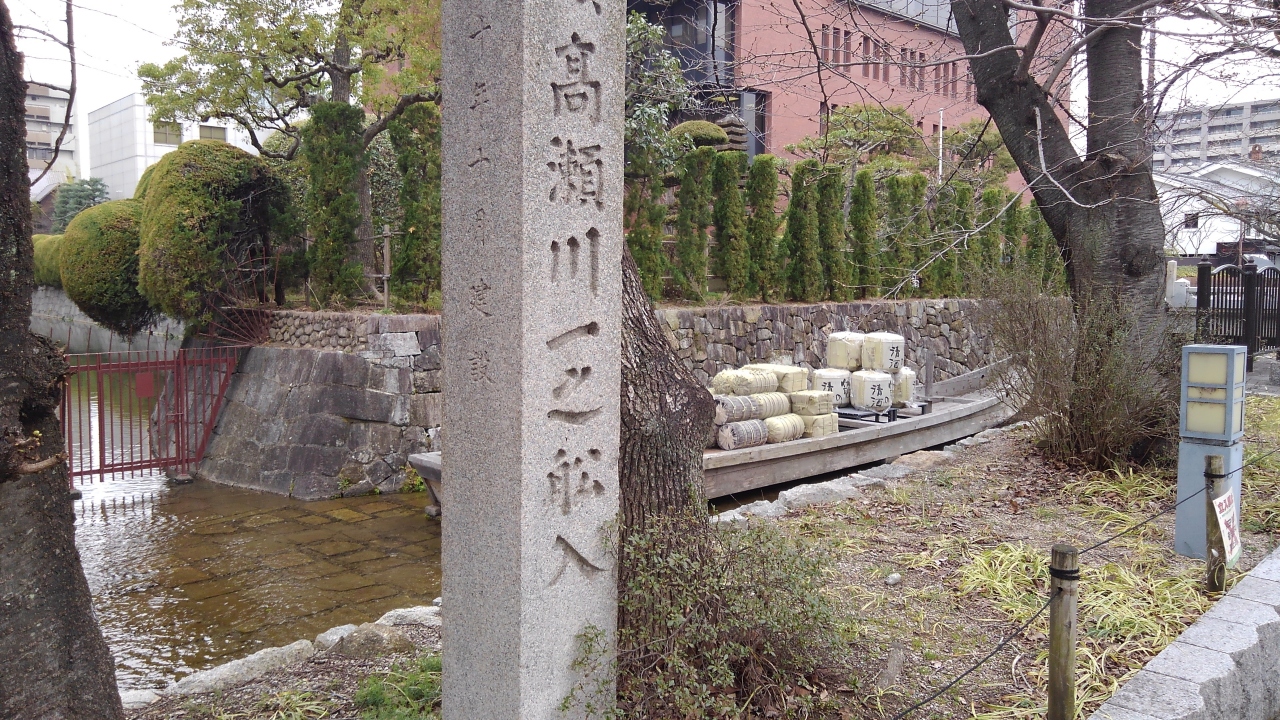 佐久間象山らの遭難碑を探して、京都は木屋町の高瀬川沿いを御池通を超え、さらに上がっていくと遭難碑とその少し北側に船が一隻浮かんでいました。