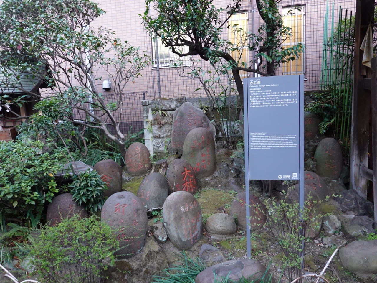 神田川沿いにある「柳森神社」の境内には見どころが多いですが、力石群もそのひとつです。新しくつくり直された案内板があり、それによると大正時代に力士が使った力石を集めたものということです。エピソードを知ってから数多く並ぶ力石を見ると、とても身近な存在に思えてきました。