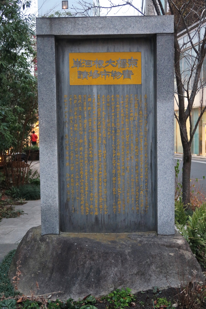 今は埋め立てられていますが、昔、京橋川があり、橋の西河岸には青物市場で賑わっていたそうです。特に大根の入荷が多かったので、大根河岸(がし)と呼ばれていました。そばには江戸歌舞伎発祥の史跡もあり、多くの人で賑わっていたことが想像されます。大根河岸は、築地市場に移転し、今は高速道路の下で少し寂しくなりました。
