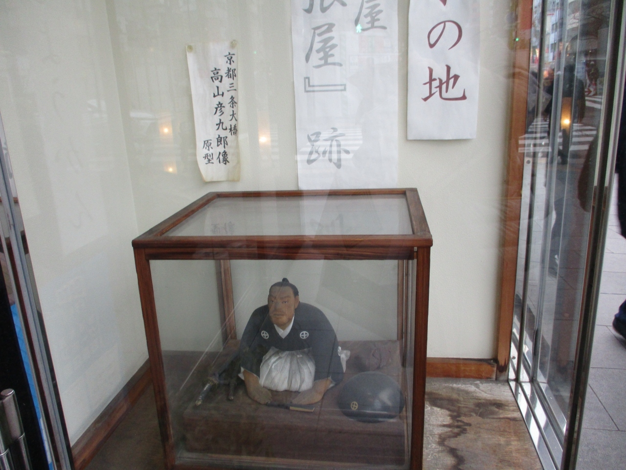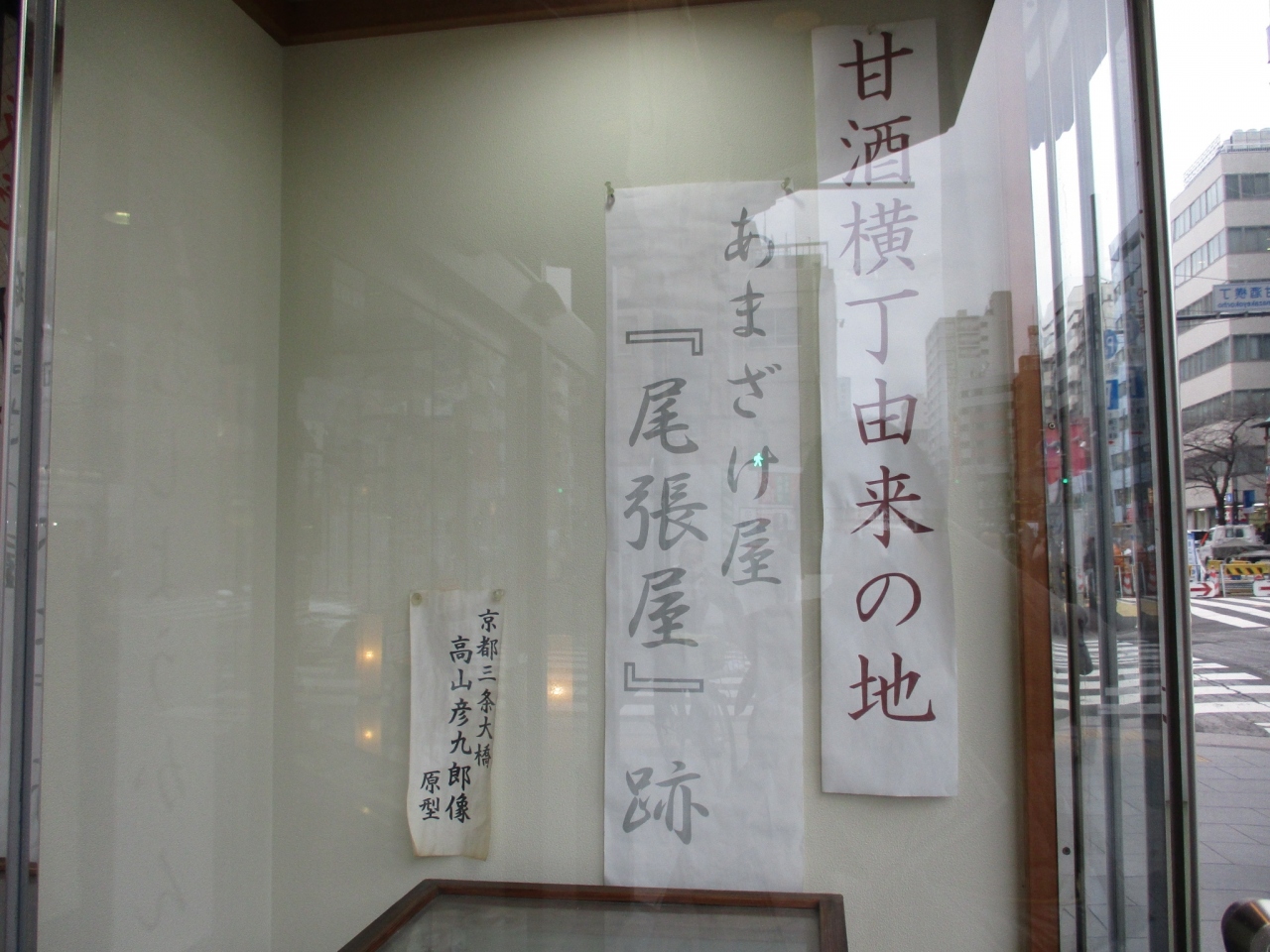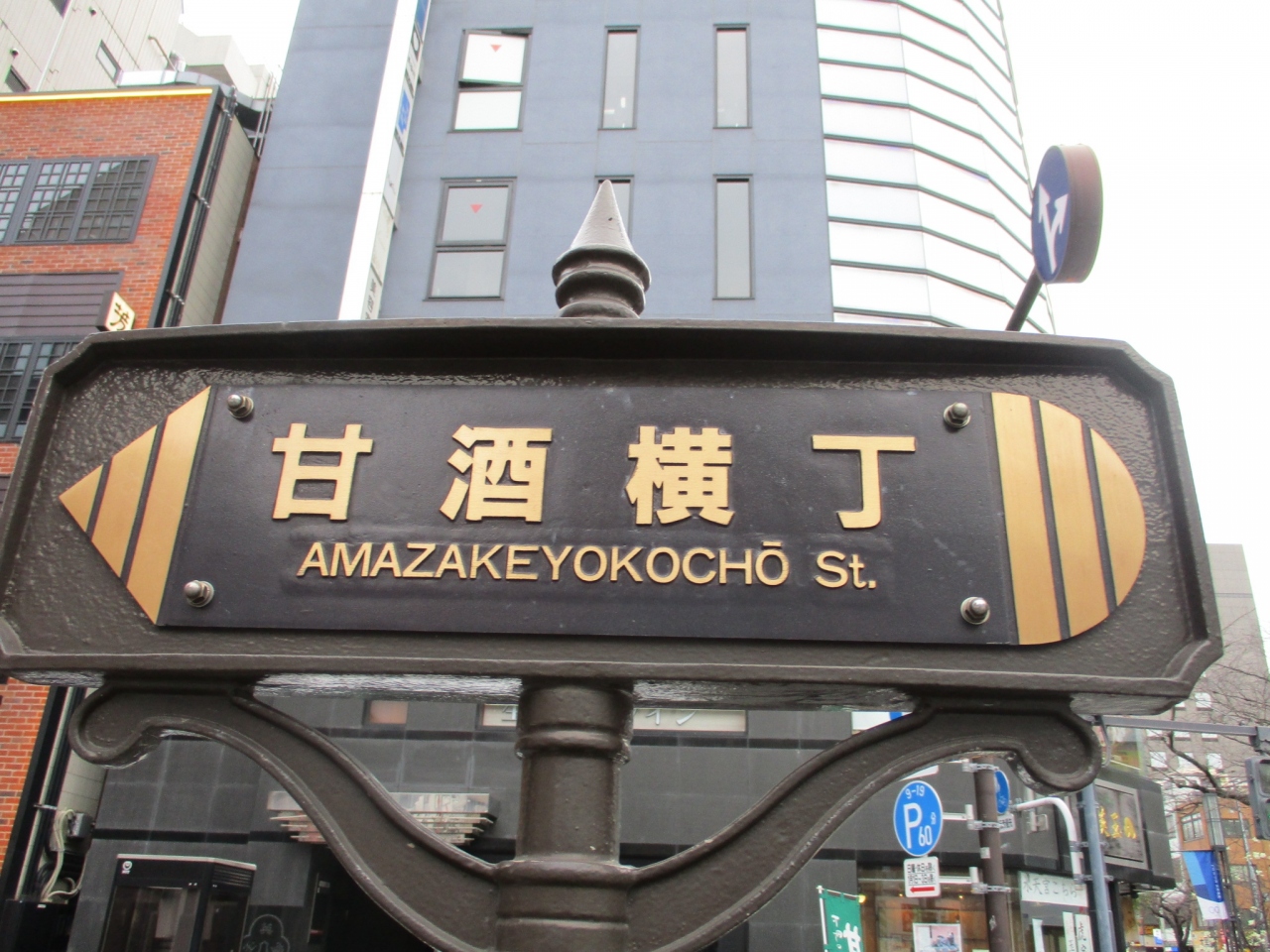 人形町駅の近くにある甘酒横丁。横丁入り口に甘酒屋があったことに由来する、下町情緒があふれる商店街です。よくある飲み屋街ではありません。たい焼き店、和菓子店、お茶の店、すし屋、雑貨店などが並んでいて楽しい通りです。甘酒横丁発祥の地「尾張屋」跡に京都三条大橋のたもとにある高山彦九郎像の原型がありました。