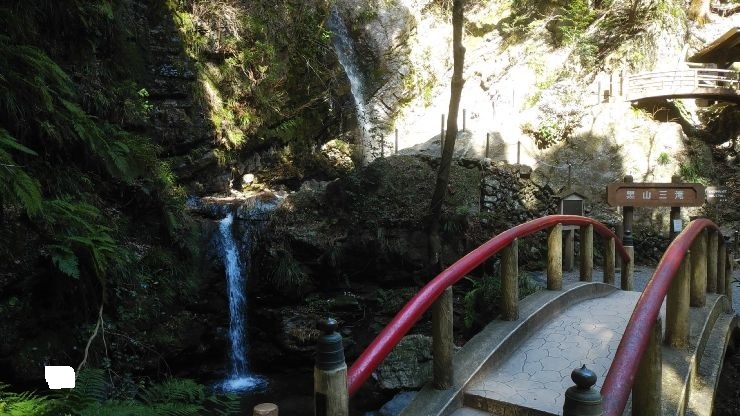 男滝、女滝、天狗滝の総称。天狗滝は手前にあるが、ちょっとした岩場の階段を上下する。訪れた時は水量が少なかった。