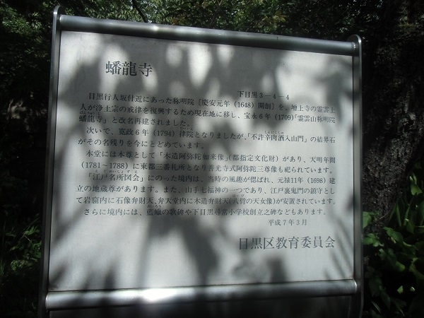 説明板によると、目黒行人坂付近にあった称明院を、増上寺の霊雲上人が浄土宗の戒律を復興するため現在地に移し、宝永6年(1709)霊雲山称明院蟠龍寺と改名再建されたそうです。