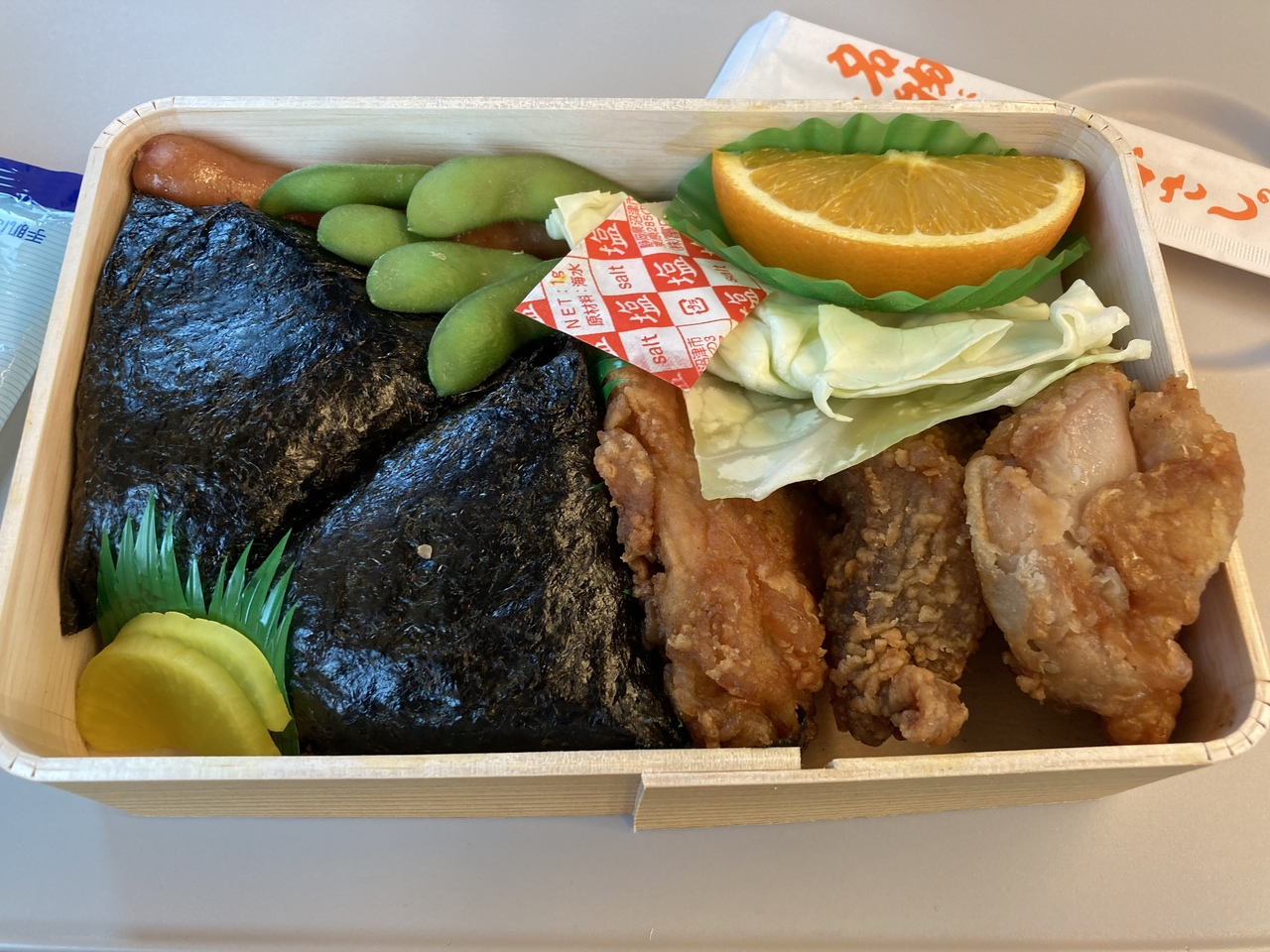 出張帰りの新幹線の車内で食べる駅弁を物色中に美味しそうなおむすびの駅弁を発見して迷わず購入しました。キャベツに塩をふりかけて食べるのが結構ビールに合います。唐揚げもボリューム満点で男性にも充分に満足出来ると思います。