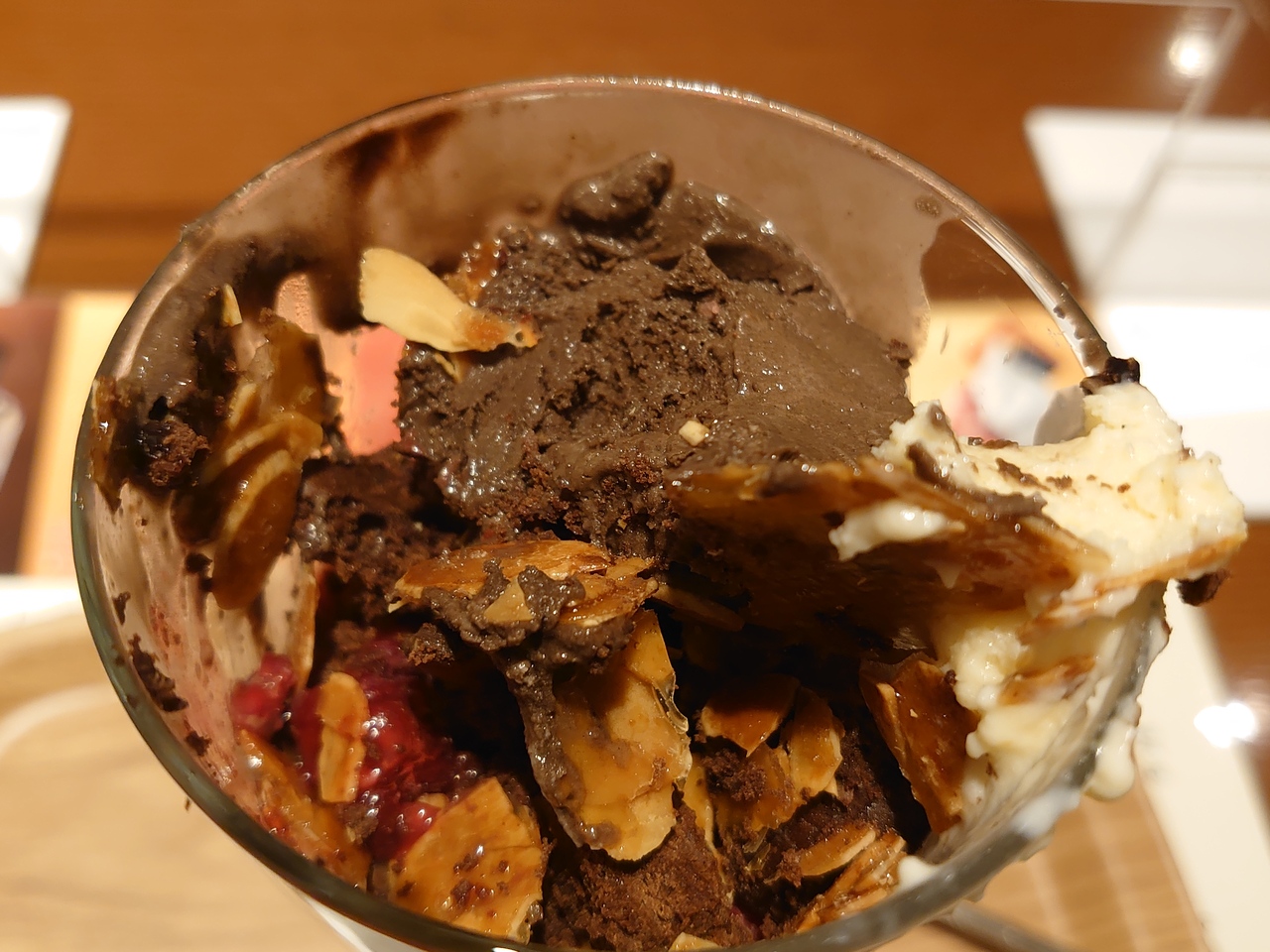 パフェは種類によって値段が異なりますが記憶の限りでは800円から1400円の間だったと思います。今回頼んだクラシックショコラは1100円だったと思います。チョコレートソースはもちろんのこと、チョコレートアイスにチョコを練ったしっとりしたパン生地などが入って、チョコのオンパレードです!
