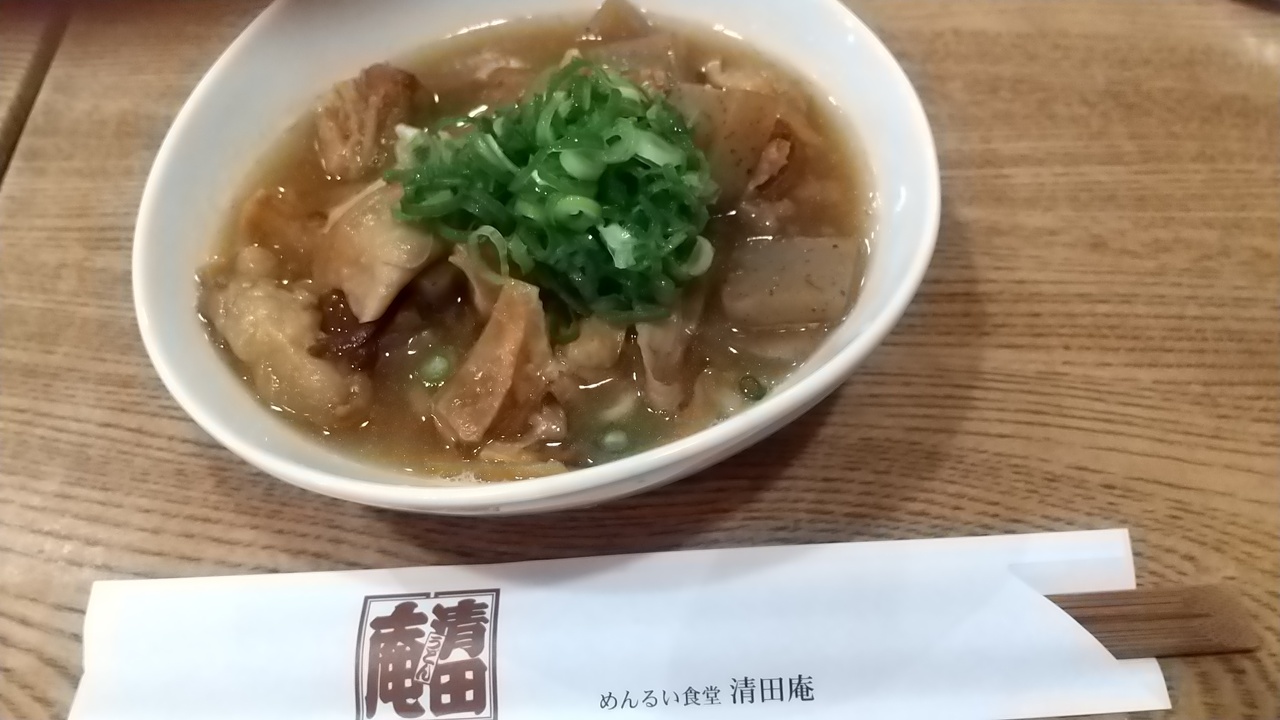 今回は餡掛けうどんと牛スジの煮込みにしました。牛スジ煮込みはコンニャクとトロトロに煮込まれたスジ肉が柔らかく、刻みネギで美味しい一品でした。