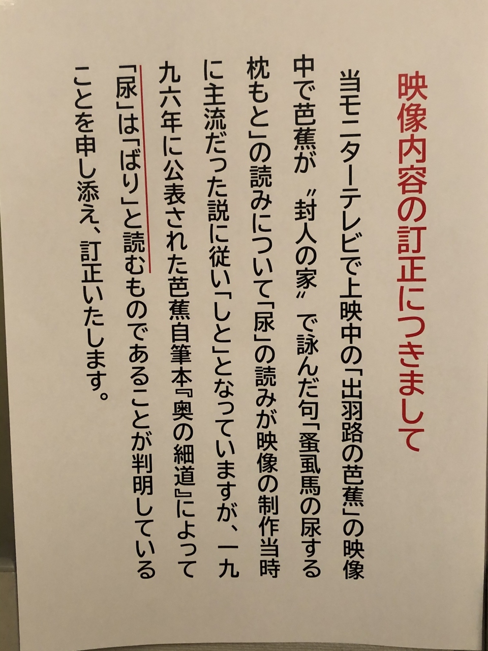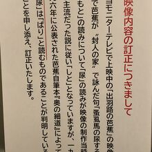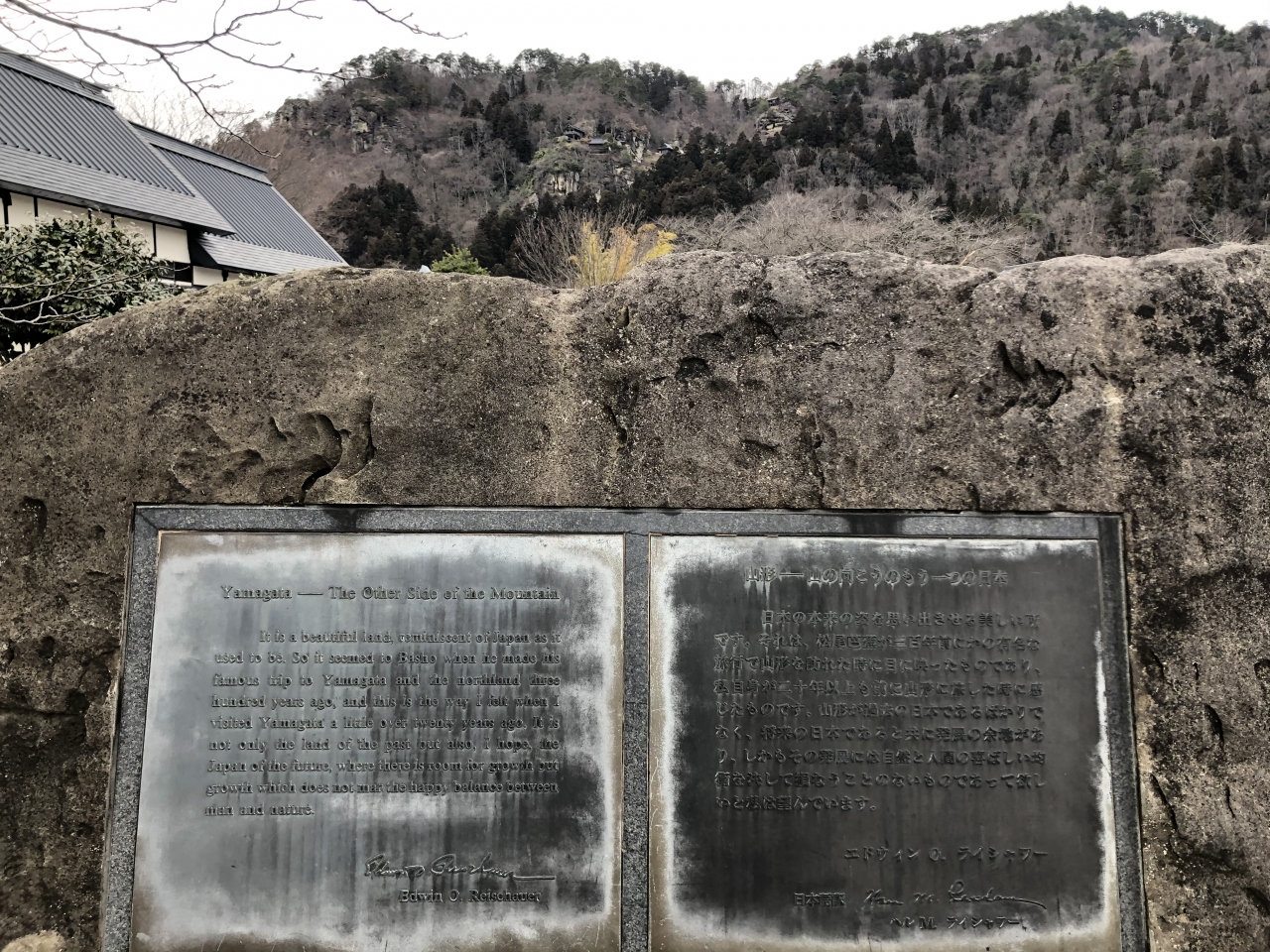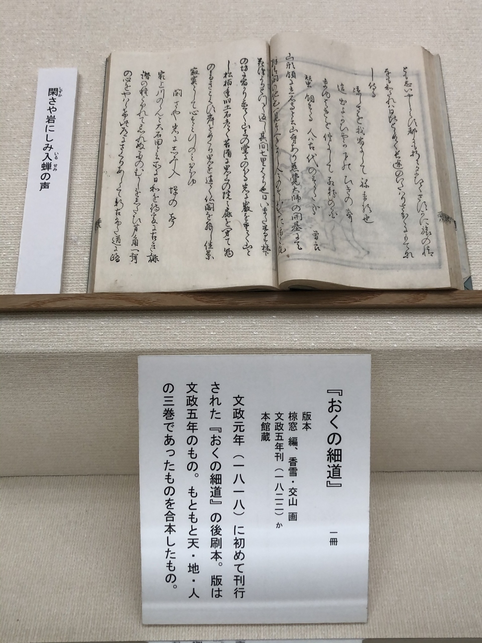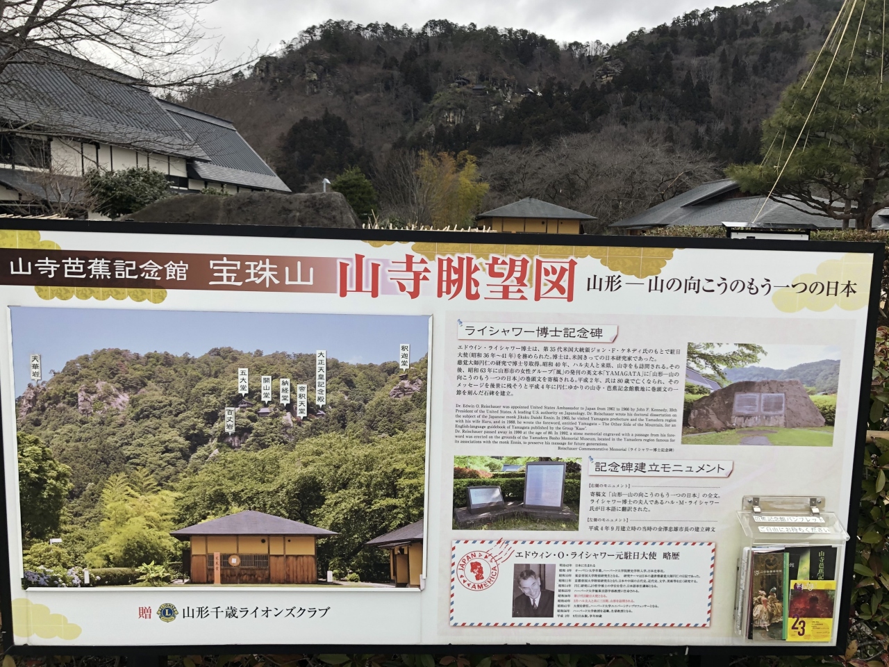 芭蕉記念館は深川、須賀川、大垣など訪れたが、この記念館の特徴は「山寺」という周囲の環境を考慮、目の前に山寺の全景を見上げる場所に位置、芭蕉自筆の書作が多数展示されていることである。また屋外には、元米国駐日大使ライシャワー博士の紀行文碑があり興味深い。
