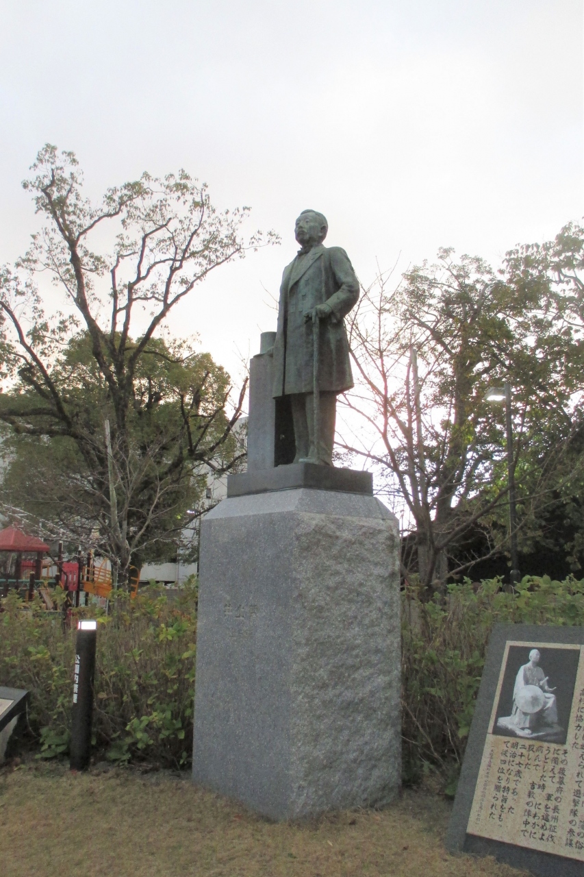井上馨像は井上公園の一画にありました。闇討ちにより重傷を負った後遺症のため、トレードマークの様になった杖を突いた姿の銅像です。井上馨は、高杉晋作らとともに、尊皇攘夷運動で活躍しましたが、維新後は新政府参与、大蔵大輔、参議兼工部卿、外務卿などを歴任しています。