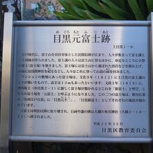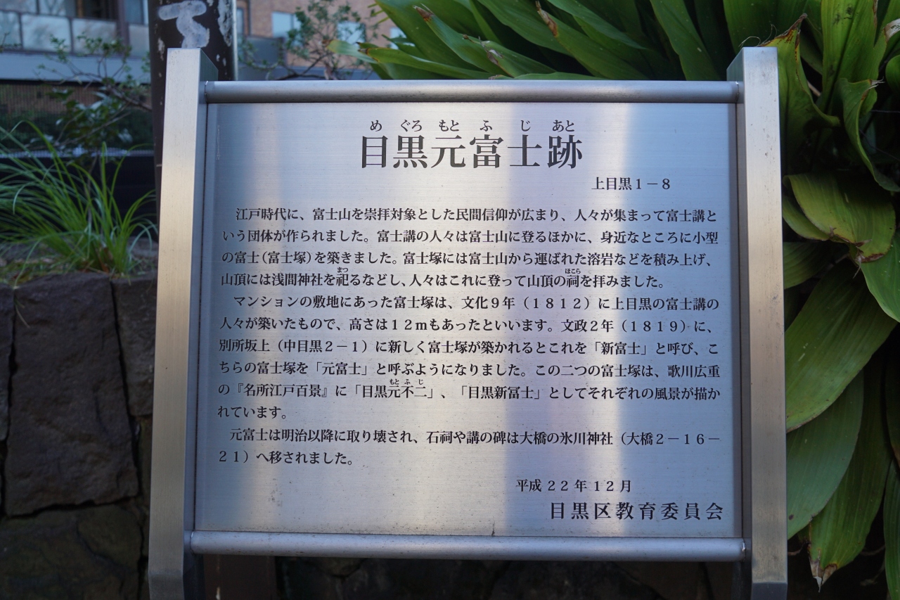 目黒元富士跡は、旧朝倉邸の門の向かい側。目黒区教育委員会の立派な説明版がありました。かつて、ここに高さ12mの富士塚があって、それは文化9年(1812年)に上目黒の富士講の人々が築いたもの。文政2年(1819年)に別所坂上に新しく富士塚が築かれるとそれを「新富士」、こちらが「元富士」に。富士塚は歌川広重の「名所江戸百景」にも描かれたほどのものだったようです。今は大橋氷川神社の方に移されています。