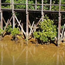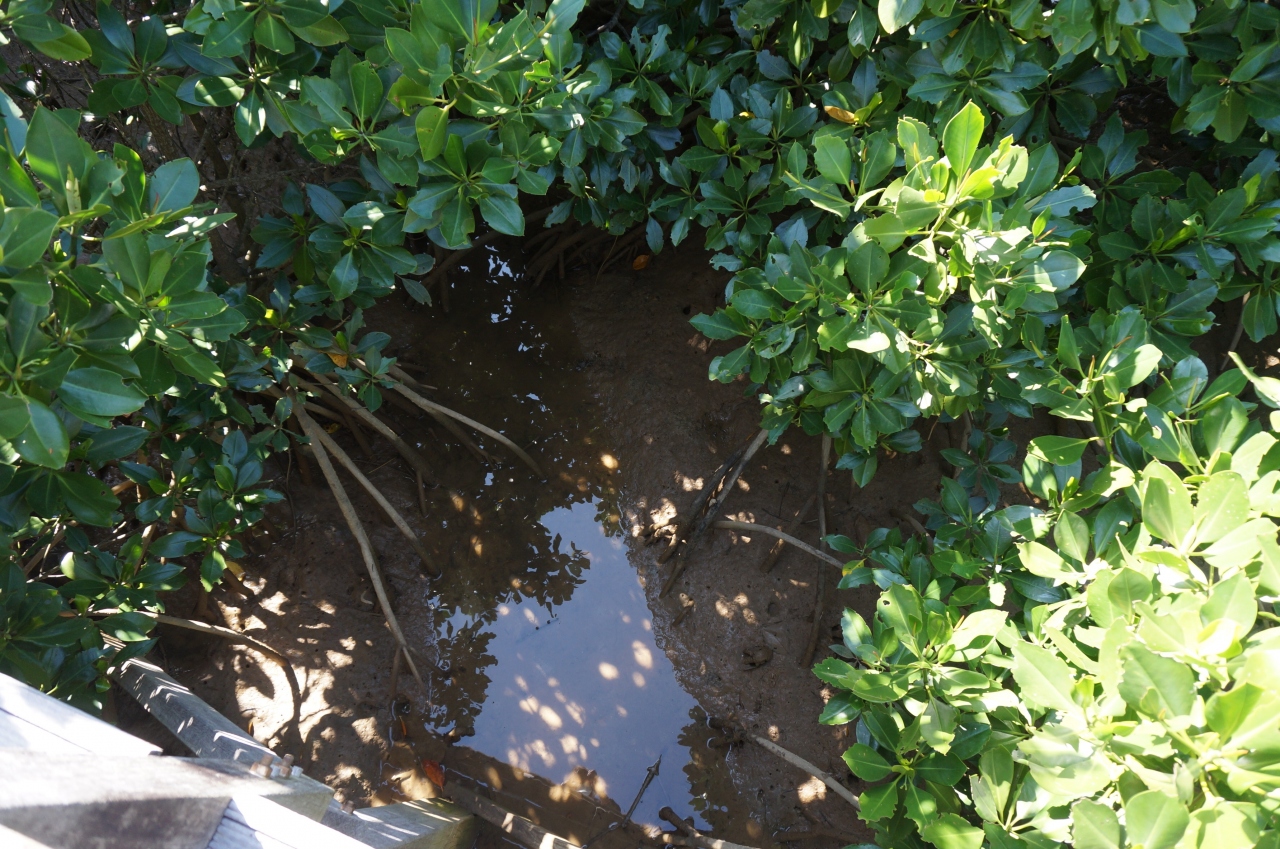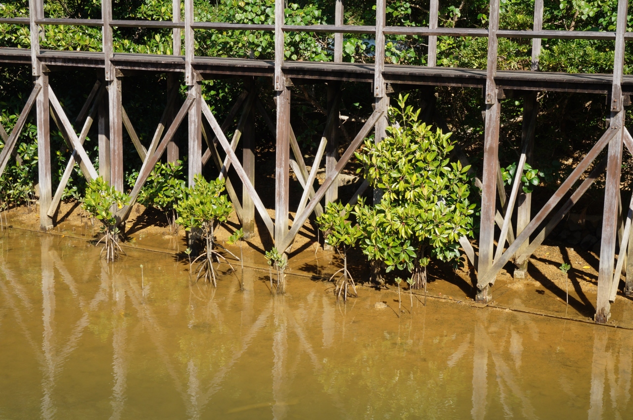 マングローブの中を通り抜ける遊歩道からは、3種のヒルギやカニなどの水生生物がみられます。