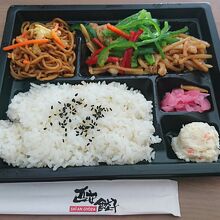 テイクアウトで利用。店内入口の左手にテイクアウト専用のカウンターあり。サンプルと作り置きのお弁当が置いてあり、品切の場合は作ってくれる。チンジャオ弁当を購入。ご飯は少し硬めだった。おかずに焼そばではく、春巻きや焼売がよかったな。