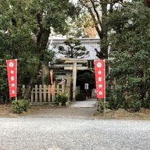 敷地の西側に梅林があり、ちょうど満開でしたので見に行きました。梅林から道を挟んで反対側(中央側)に沢山の幟をはためかせていたのがこちらの神社。どうやら音楽関連の神様をお祀りしているようでした。