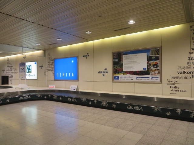 北海道の玄関口ということで、とにかくお店が多いです。北海道に来たことを実感します。荷物受け取りの場所にも、白い恋人パークの看板がありました。あとcalbeeのお店では、ポテトチップスの実演販売があったりして楽しいです。
