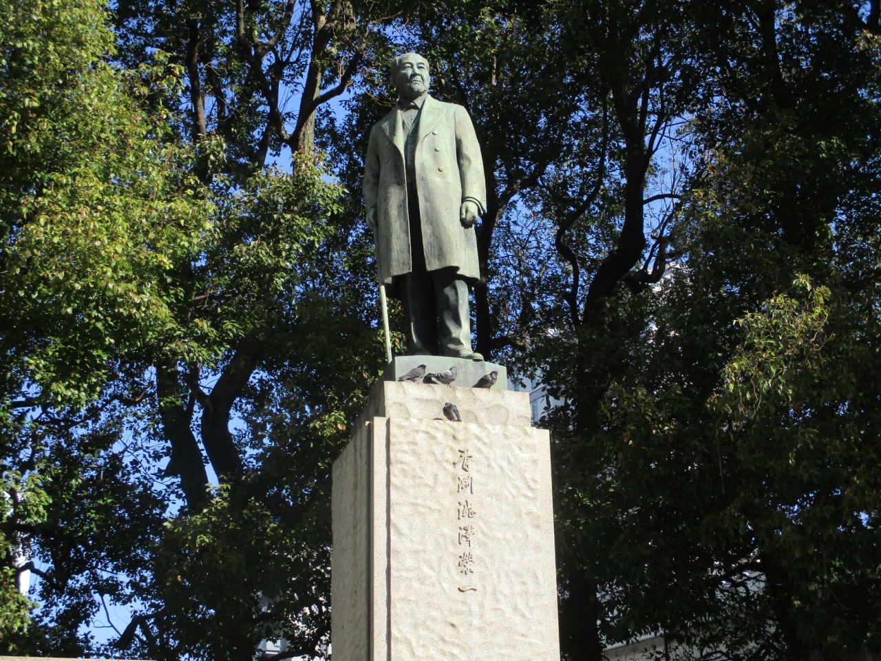 日本橋川にかかる常盤橋のそばに、高い台座の上に立つ「渋沢栄一銅像」がありました。渋沢栄一は農家の出身で、徳川慶喜に仕え、その後幕臣となりフランスへ行きました。維新後、明治政府で勤めを経て実業界へ転身しました。株式会社の考え方を広め、日本近代経済の基礎を築きました。東京商工会議所・初代会長です。このあたりは訪れた時工事中が目立ちましたが、像は近くで見ることができました。