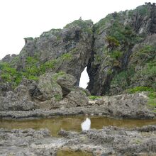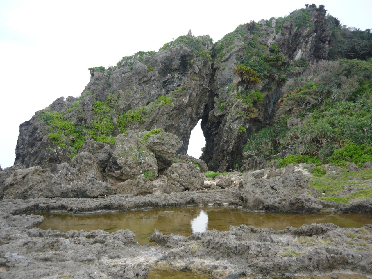 久米島北部の海辺にそそり立つ穴が開いた大岩です。子宝に恵まれるというパワースポットだそうで、大きな岩に穴が開いているのかと思っていましたが、よく見ると二つの岩がもたれかかった様な状態で岩が裂けているように見えるものでした。岩の周りの海岸にはゴミや漂着物があるのが残念でした。ごつごつした岩場や滑りやすいところもあるので歩きやすい靴が良いです。