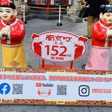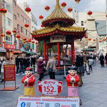 南京町のマスコットのお人形「財財(ザイザイ)」と「来来(ライライ)」も目立っています。
