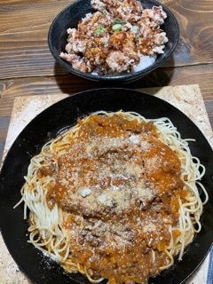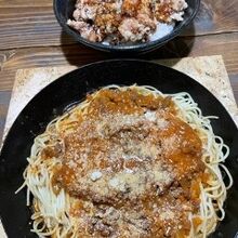 鉄板にはアルデンテぽい湯で加減の麺にミートソースがかかっています。