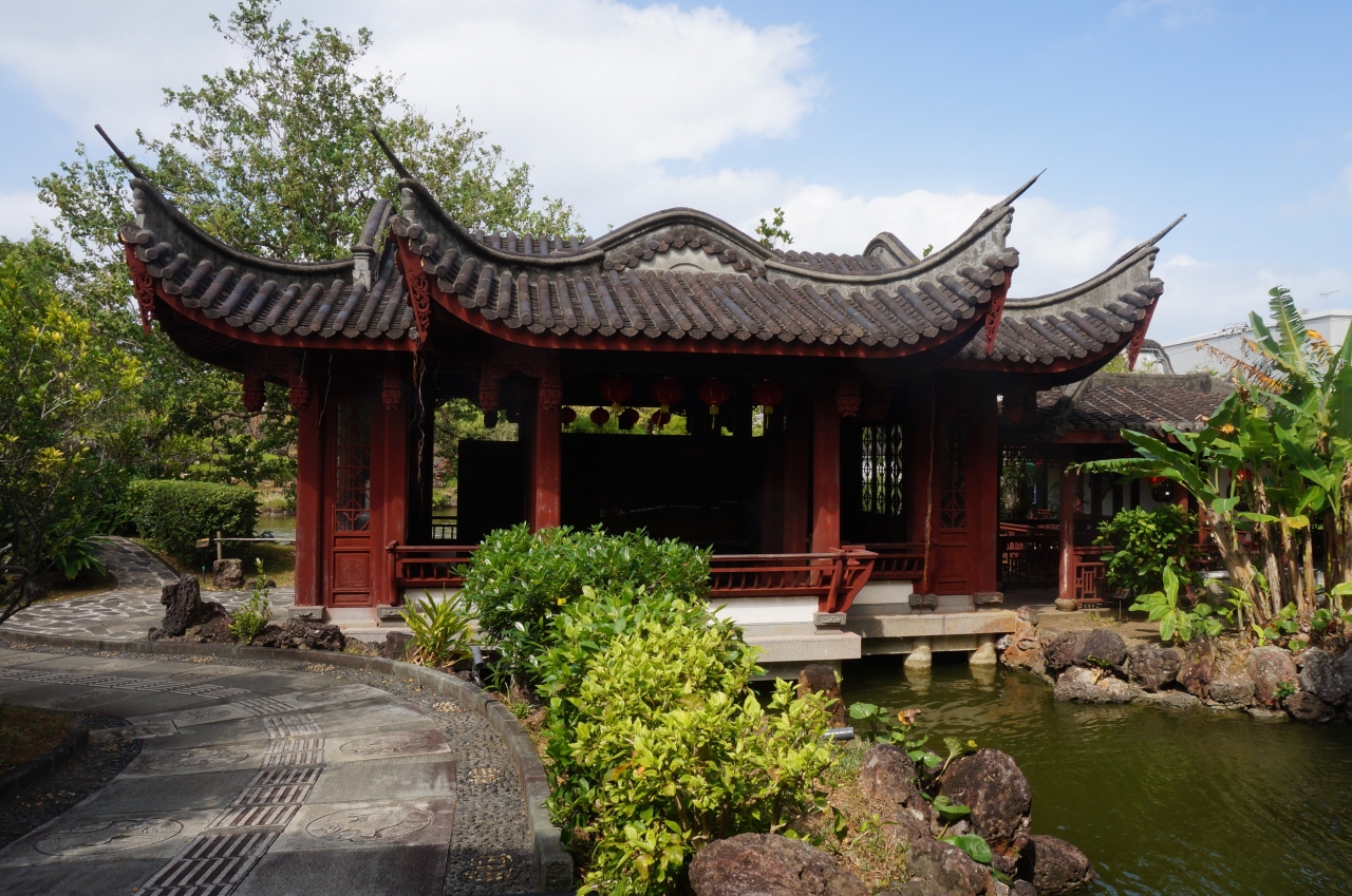 流れ出る滝の上に建つ冶亭に上ると、園内を一望できます。